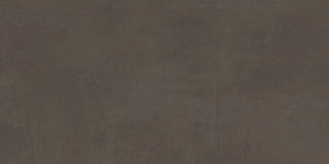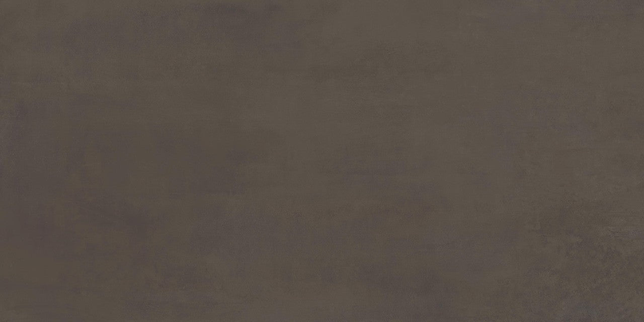 La robe de ce revêtement est essentiellement constituée d'un brun foncé intense, dense et minéral, sur lequel viennent se fondre des nuances de marron sépia qui apportent une légère profondeur sans créer de rupture. Le mariage de ces tons chauds et tereux rappelle la surface d'un béton ciré vieilli, avec cette qualité propre au grès cérame : une variation chromatique V2, c'est-à-dire des légères fluctuations naturelles d'un carreau à l'autre, qui confèrent à la pose une lecture vivante, jamais mécanique. La finition mat, lisse au toucher, absorbe la lumière plutôt qu'elle ne la réfléchit, renforçant le caractère sobre et posé de l'ensemble. Le format carré 90x90 cm, en grand format, favorise une lecture continue du sol, avec un minimum de joints apparent pour une continuité visuelle optimale.