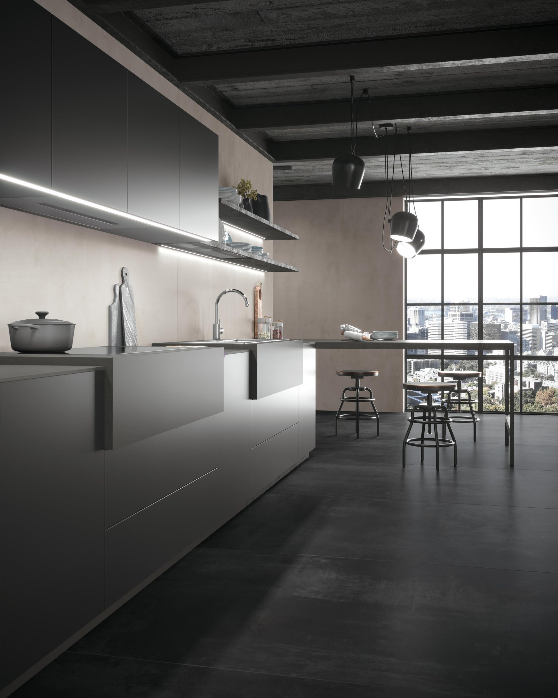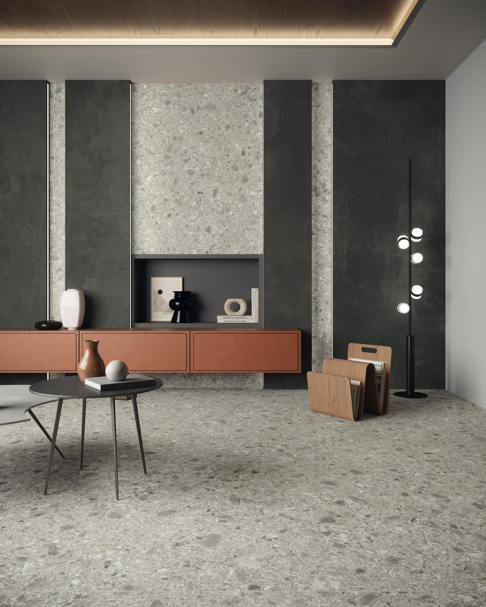 Le carrelage effet béton gris nuit Gravino s'installe sur les murs intérieurs avec une présence que peu de revêtements atteignent. En format 278x120 cm, chaque carreau occupe la paroi comme une dalle unique, effaçant les joints et installant une atmosphère minérale, sourde et contemporaine. C'est l'alternative réelle au béton ciré : même intensité visuelle, finitions maîtrisées et durabilité certifiée.