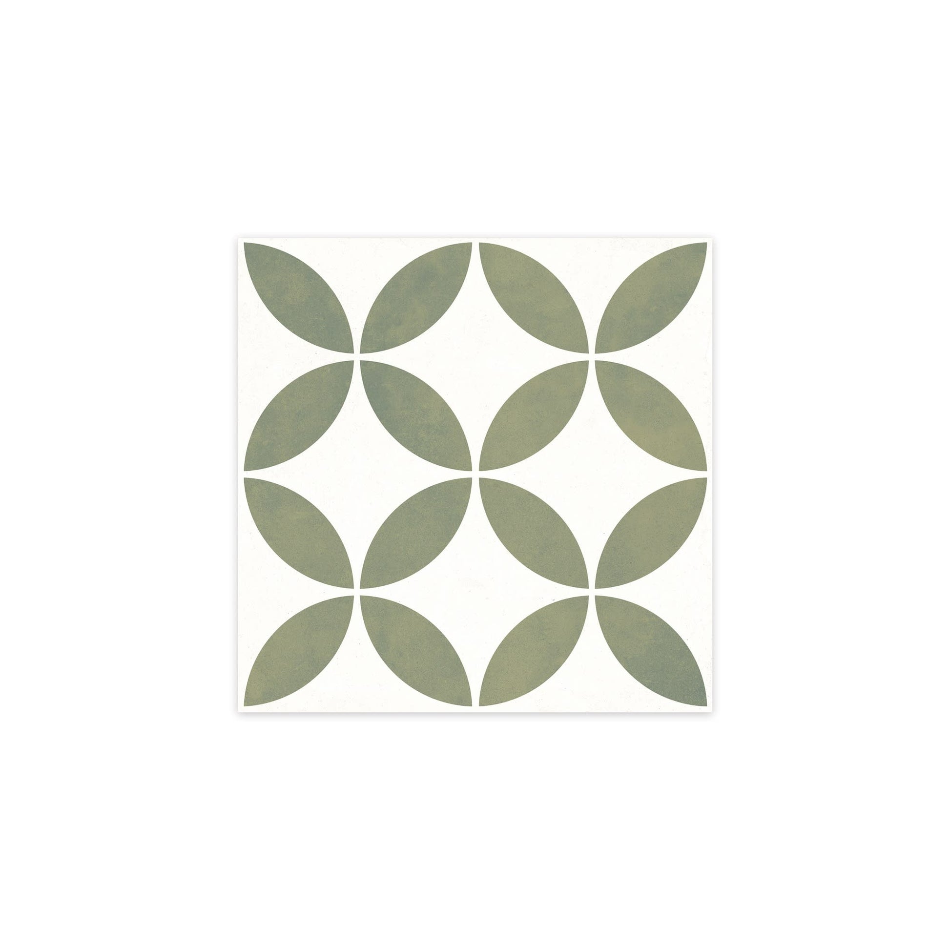 Ce carrelage imitation carreaux de ciment repose sur une base en grès cérame, une matière dense et non poreuse. La teinte greige s'étend de façon uniforme sur la face visible, sans variation de ton marquée. La finition mate atténue les reflets et donne à la paroi une lecture sobre, presque minérale. Le format 22,3x22,3 cm, avec ses joints réguliers, renforce l'effet géométrique propre aux carreaux de ciment traditionnels.