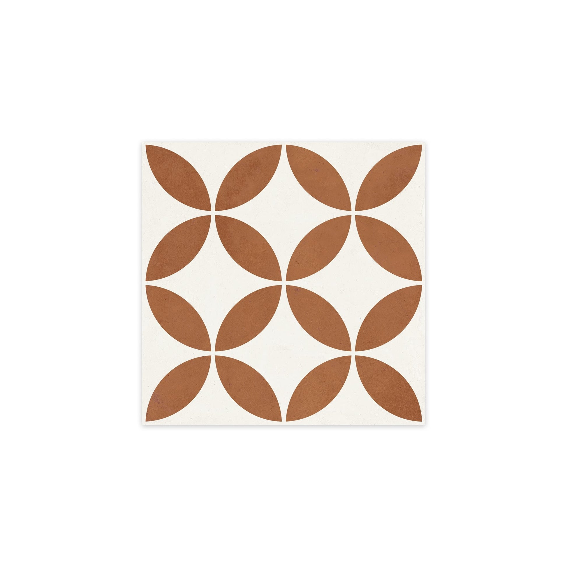 La face visible reproduit les motifs géométriques et les nuances terracotta typiques du carreau de ciment, avec des variations de teinte d'un élément à l'autre. Le fond blanc dominant contraste avec les tons chauds de la décoration. La matité de la finition absorbe la lumière sans reflet, ce qui accentue la profondeur du motif. Le grès cérame confère à ce carrelage imitation carreau de ciment une densité et une homogénéité que la terre cuite pressée ne peut pas atteindre.