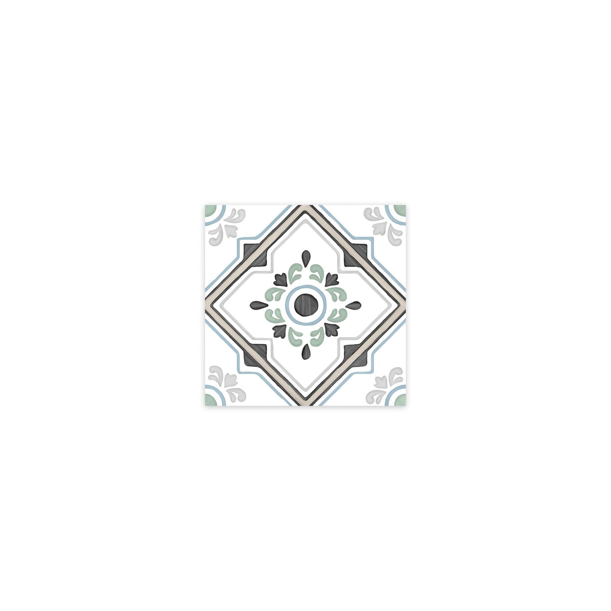 La palette chromatique de la série Cirelia repose sur un fond essentiellement blanc cassé, traversé de nuances de gris ardoise qui structurent le motif sans jamais l'alourdir. La finition lisse et mate absorbe la lumière rasante pour révéler la profondeur du dessin, tandis que la variation chromatique V2 — légère et calibrée — assure une cohérence visuelle sur de grandes surfaces sans uniformité artificielle. Le grain de surface, fin et tendu, donne à la main comme au regard une sensation de matière posée, minérale, proche du vrai carreau de ciment dans ses tonalités comme dans son caractère graphique.
