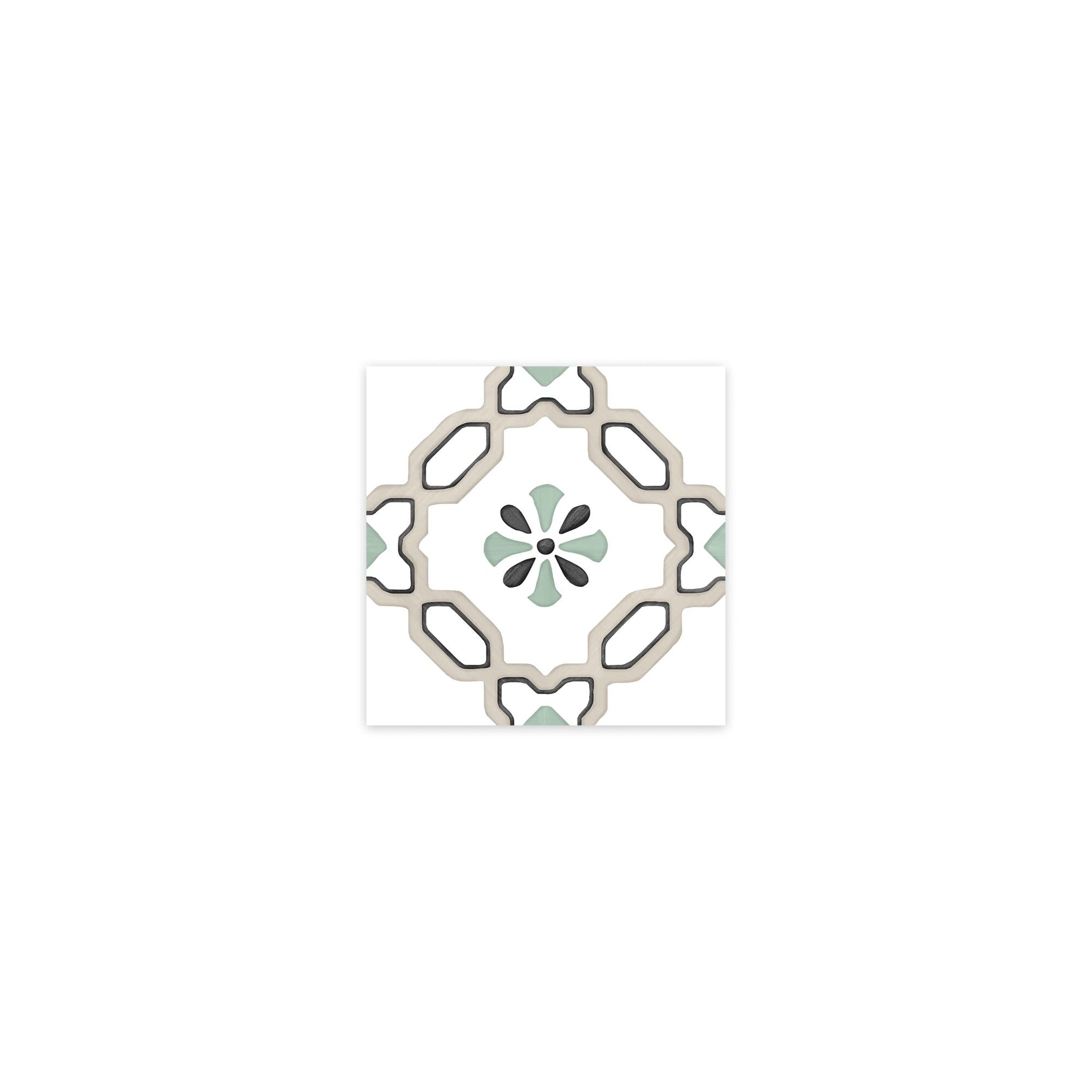 Le Carrelage effet Carreau ciment Marilis Beige 12,3x12,3x0,87 cm Tanerio pose un motif floral et ornemental sur un fond blanc, relevé de nuances gris et vert.