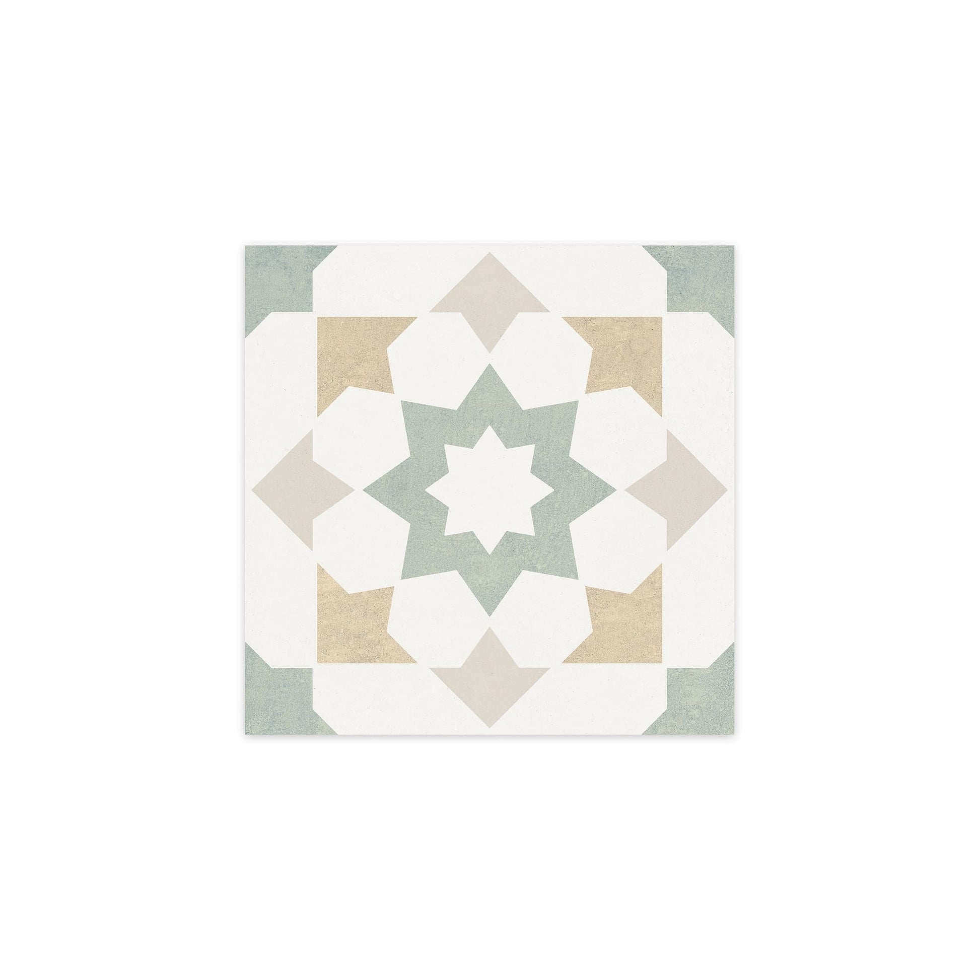 Ce carrelage imitation carreaux de ciment est fabriqué en grès cérame. La face visible présente un motif floral et ornemental sur fond blanc, rehaussé de nuances vert, jaune et gris. L'aspect est mat, la texture lisse au toucher. Ces teintes contrastées confèrent à chaque dalle une présence graphique affirmée, sans surcharge visuelle. Le format 22,3x22,3 cm, carré, facilite la pose en joint droit ou en décalé.