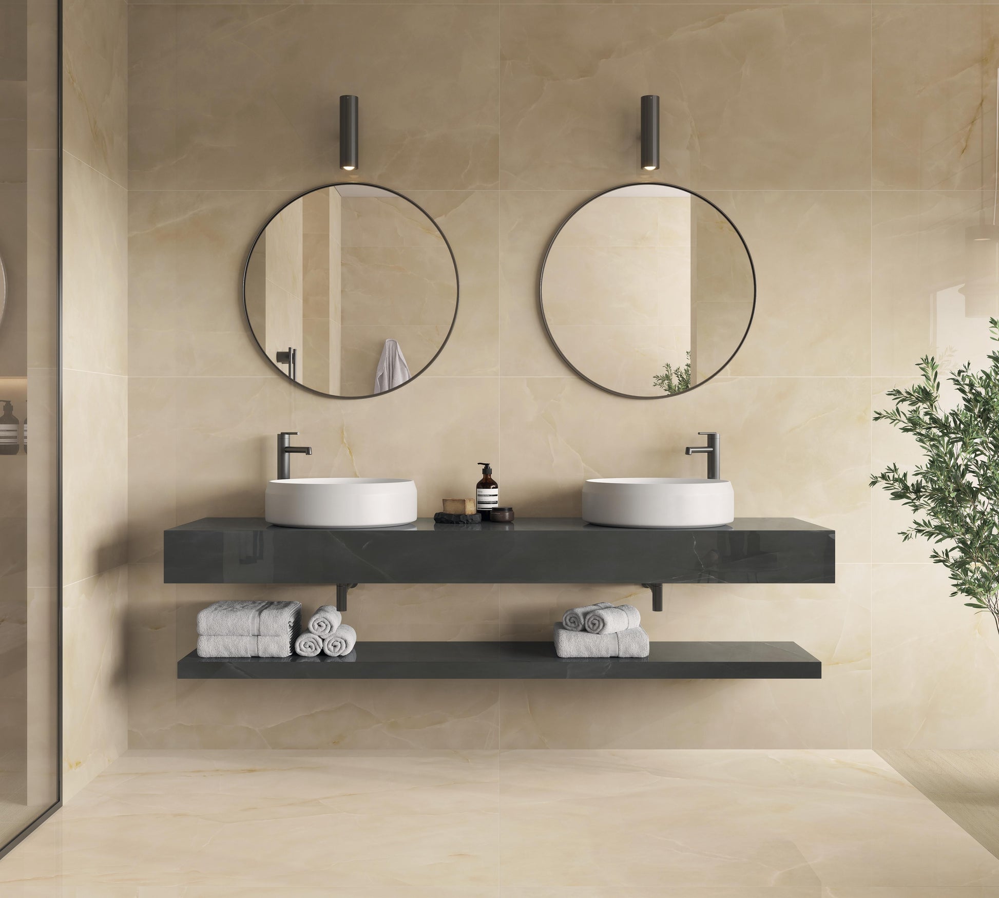 La teinte beige albâtre constitue le fond du décor : une base claire, presque laiteuse, traversée de veines fines aux tons crème, ivoire et champagne. Les variations chromatiques moyennes (V3) assurent un jeu subtil de nuances d'une dalle à l'autre, créant une pose vivante sans rupture visuelle brutale. Le motif mélange confère à chaque pièce son propre caractère, à la manière d'une pierre extraite d'un même bloc mais jamais strictement identique. La finition brillante amplifie cet effet : la surface lisse et vitrifiée agit comme un miroir doux, donnant de la profondeur aux veines et de l'ampleur à l'espace. L'épaisseur de 9 mm et les bords rectifiés permettent des joints fins qui préservent la continuité visuelle du sol, accentuant l'effet de dalle monolithique si recherché dans les intérieurs contemporains.