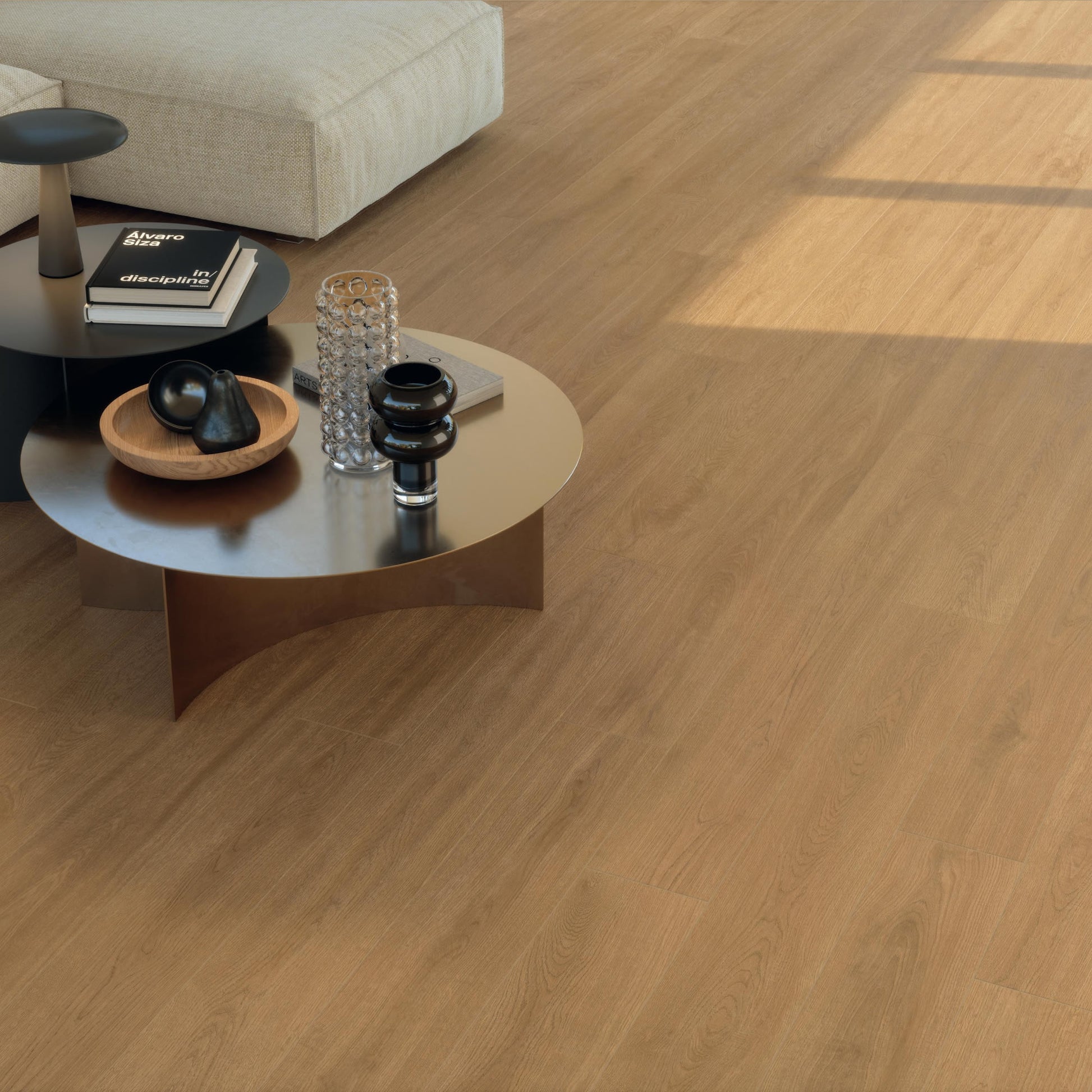 Le carrelage effet parquet bois chêne miel Pure Forenza apporte dans l'espace intérieur cette qualité rare : la chaleur immédiate du bois, ancrée dans la solidité maîtrisée du grès cérame. Dès le premier regard, la pièce gagne en profondeur et en sérénité.