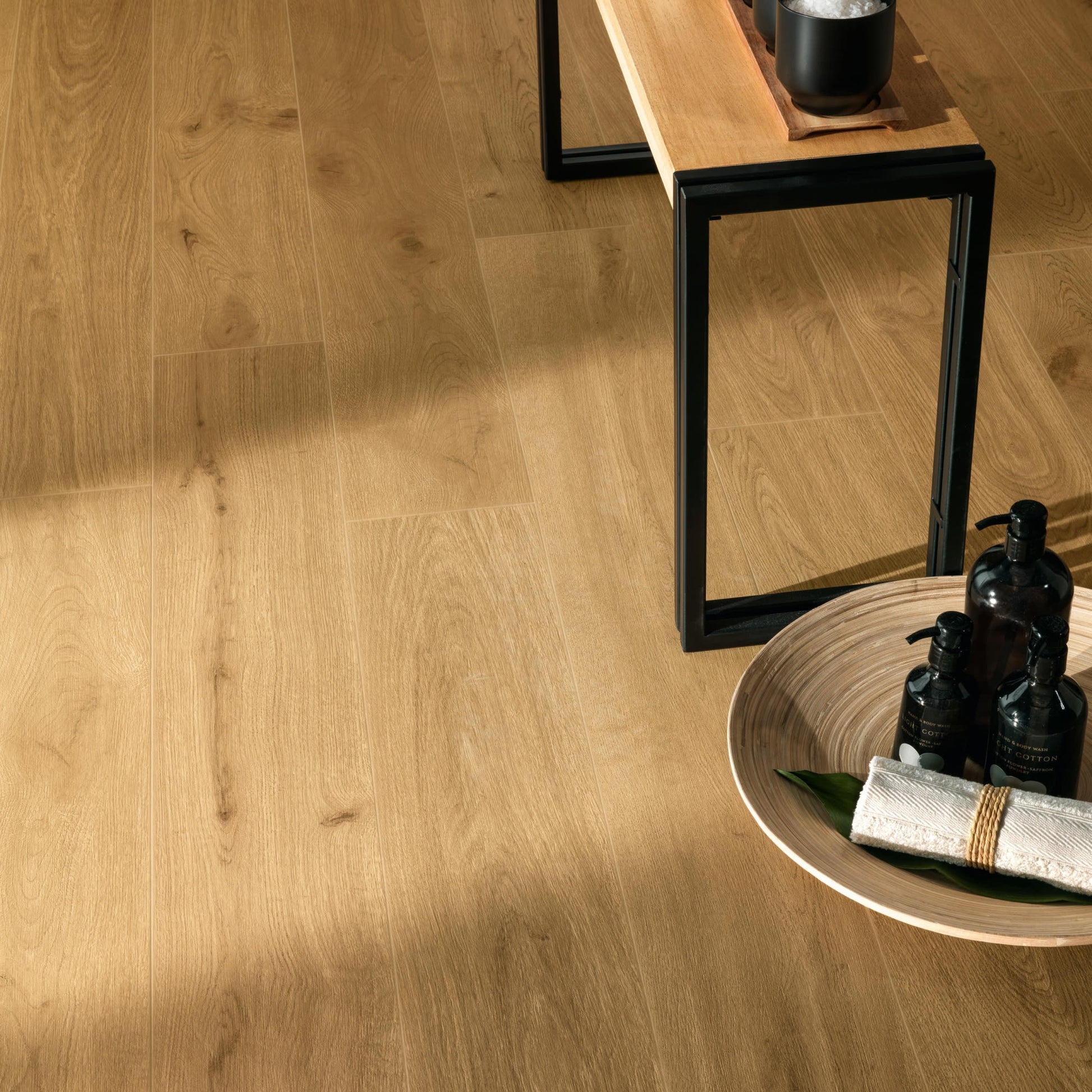 Posé en pose à l'anglaise ou à bâtons rompus, le format 150 x 18,5 cm structure visuellement une pièce de vie, un couloir ou une suite parentale avec la rigueur d'un vrai plancher. Il s'adapte en revêtement mural dans une salle de bain ou une cuisine, apportant la chaleur du bois là où le bois massif ne peut pas aller. Son épaisseur de 9 mm et ses bords rectifiés permettent une pose jointoyée serrée, au millimètre, pour un rendu architectural soigné. Après la pose, il est conseillé de protéger les joints avec un hydrofuge adapté et de nettoyer le revêtement à l'aide d'un détergent neutre légèrement dilué.