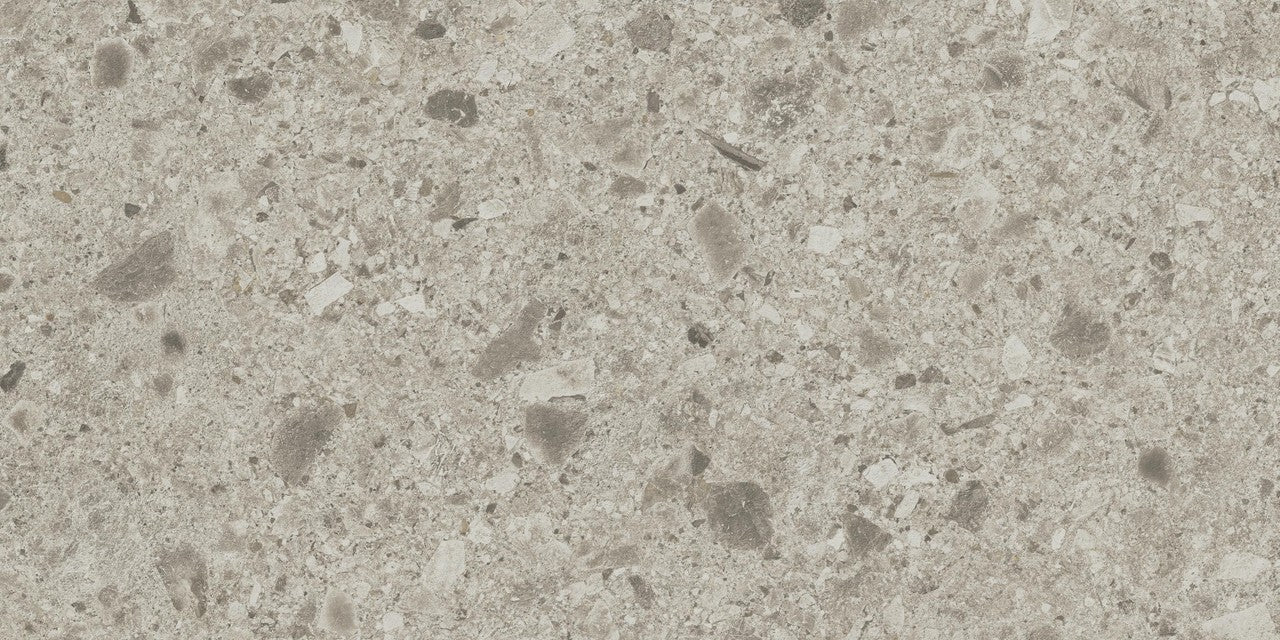 Ce carrelage en grès cérame reproduit fidèlement la texture du Ceppo di Gré, une roche sédimentaire aux inclusions irrégulières et aux nuances de gris clair. La face visible, mate et lisse, absorbe la lumière sans la renvoyer. Le grain est fin, la teinte homogène avec des variations naturelles d'un carreau à l'autre. Ces dalles effet pierre affichent un format 120x60 cm pour des joints réduits et des lignes épurées au sol comme en paroi.