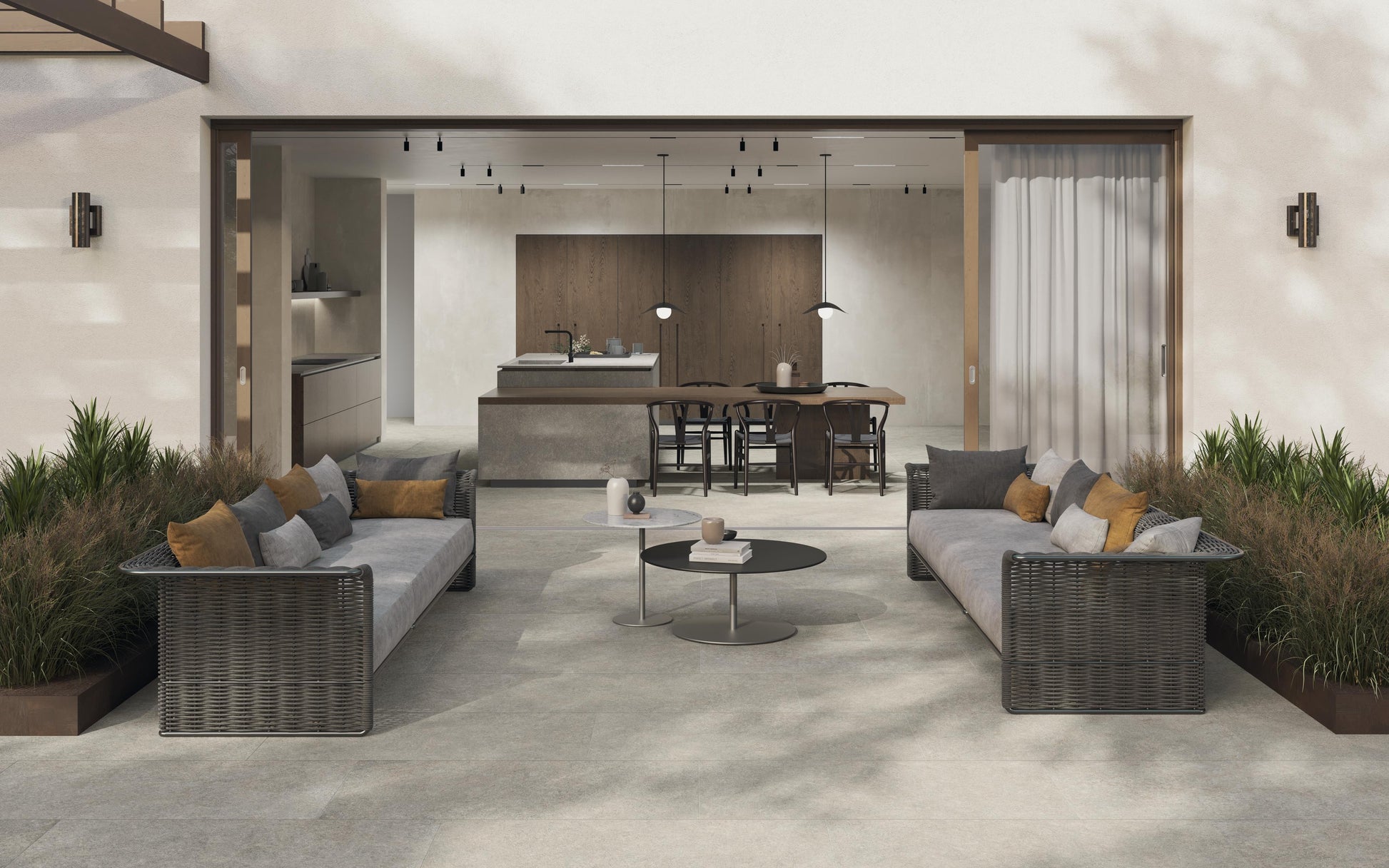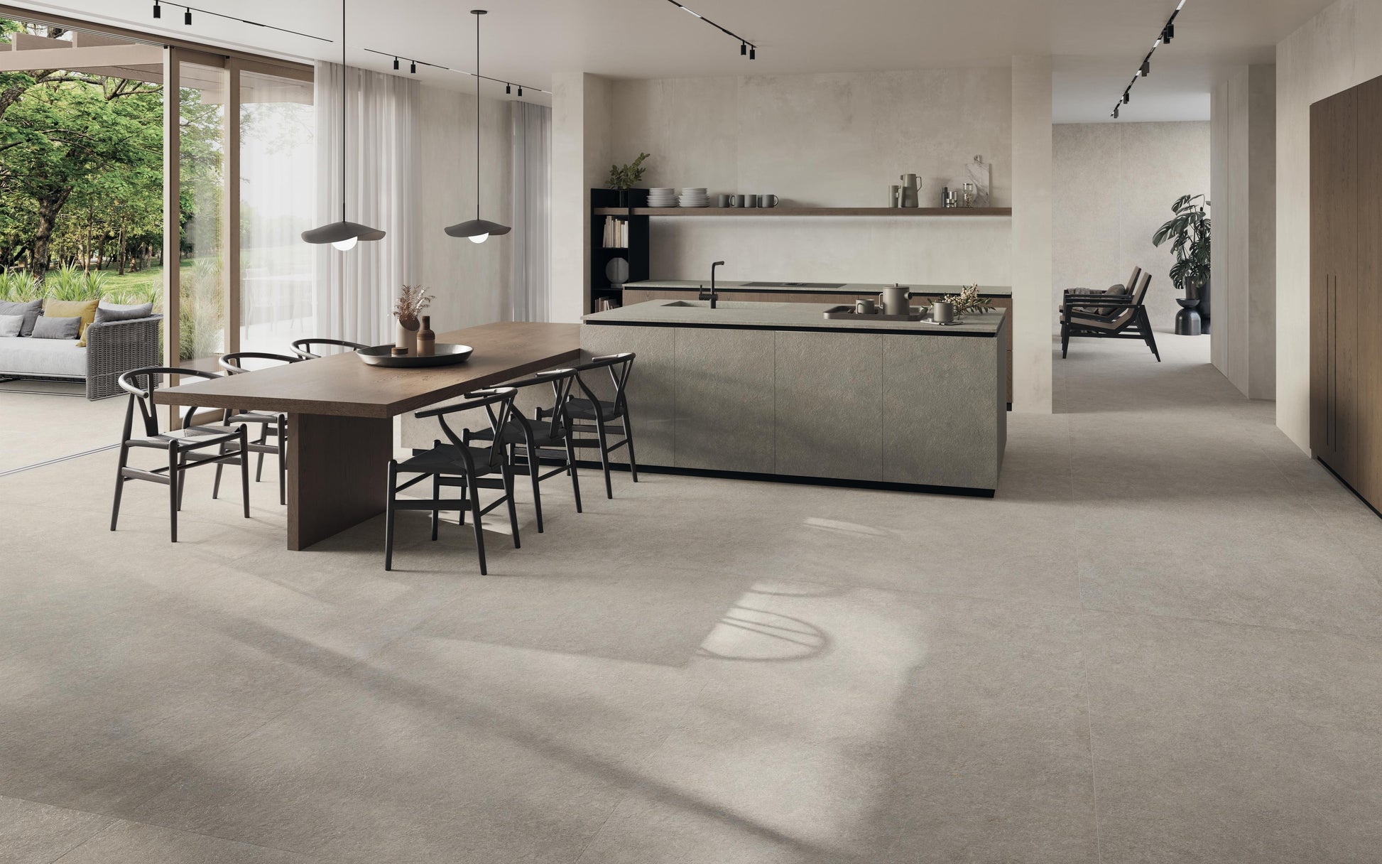 La collection Venturo traduit avec précision la texture brute du quartzite dans un matériau céramique de haute performance. La surface structurée offre une adhérence naturelle au toucher tout en conservant la lisibilité graphique des veinures. Le format 278x120 cm en épaisseur 6 mm réduit les joints au strict minimum, ce qui amplifie la continuité visuelle sur de grandes surfaces murales. La variation chromatique reste maîtrisée : les nuances évoluent avec discrétion d'une dalle à l'autre, garantissant un posé cohérent et un rendu homogène sur l'ensemble du parement.