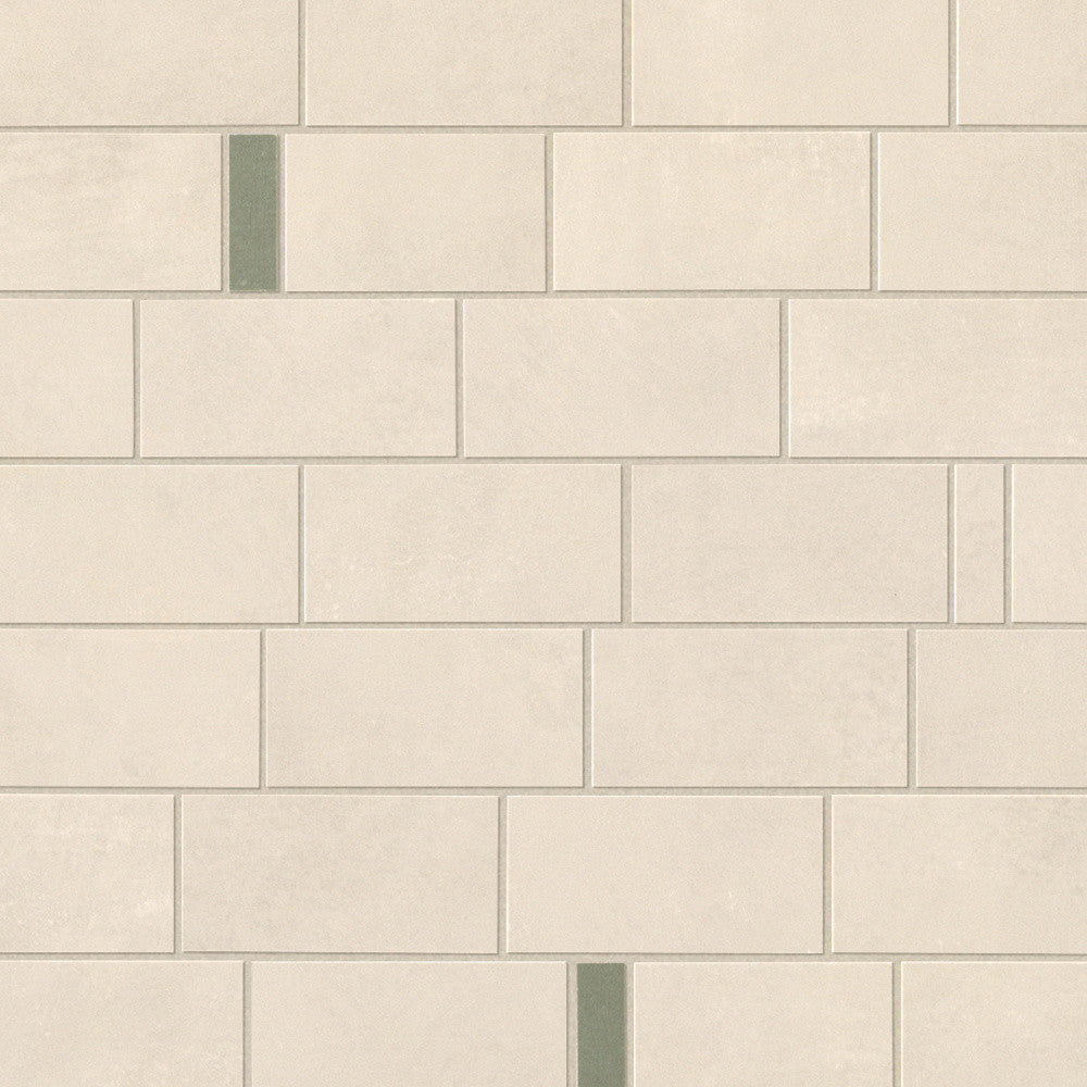 La teinte de fond est essentiellement un beige crème doux, évoquant la matière brute du béton ciré ou du mortier patiné. Ce fond lumineux est parcouru de nuances de vert sauge, discrètes, qui apportent une profondeur inattendue sans rompre l'équilibre général. La finition est majoritairement mate, avec quelques accents légèrement brillants qui animent la surface au gré de la lumière rasante. La texture, lisse avec une légère granularité perceptible, renforce l'authenticité minérale de l'ensemble. La variation chromatique de niveau V2 garantit une cohérence entre les plaques posées, avec de légères nuances qui préservent le caractère vivant et naturel du rendu final.